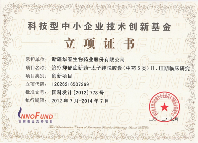 科技型中小企業(yè)技術(shù)創(chuàng)新基金立項(xiàng)證書(shū)