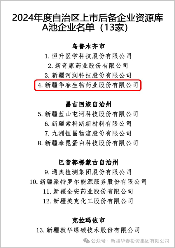為優(yōu)化充實(shí)新疆上市資源,提升自治區(qū)上市后備企業(yè)資源庫(kù)整體質(zhì)量,培育更多優(yōu)質(zhì)企業(yè)赴多層次資本市場(chǎng)上市掛牌和融資,讓實(shí)體企業(yè)更好地參與和服務(wù)建設(shè)自治區(qū)“八大產(chǎn)業(yè)集群”,3月4日,自治區(qū)地方金融管理局公示了2024年度入庫(kù)上市后備企業(yè)名單,新疆華春生物藥業(yè)股份有限公司(簡(jiǎn)稱華春藥業(yè))又被列入后備企業(yè)資源庫(kù)A池。