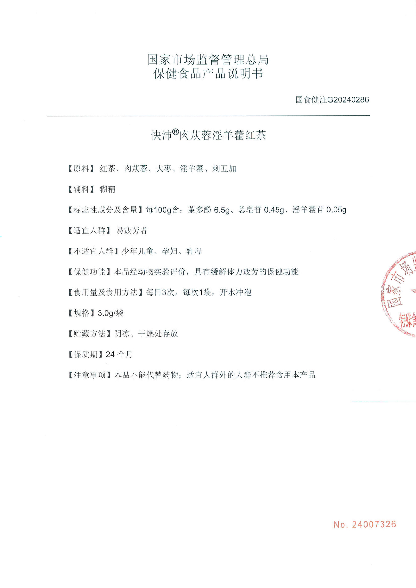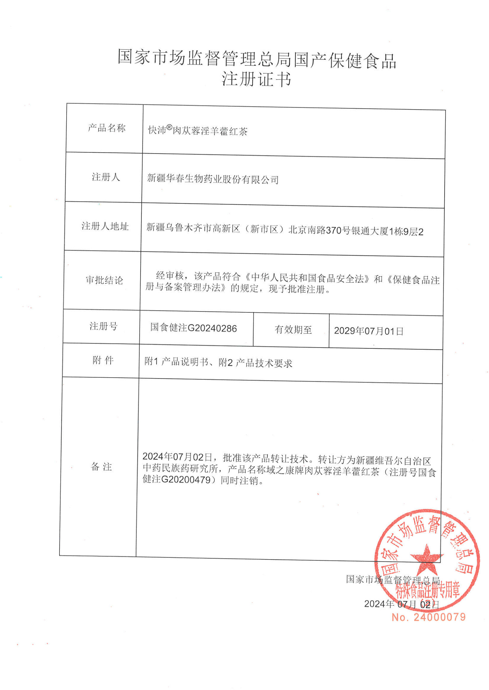新疆華春生物藥業(yè)股份有限公司快沛◎肉蓯蓉淫羊藿紅茶注冊證書
